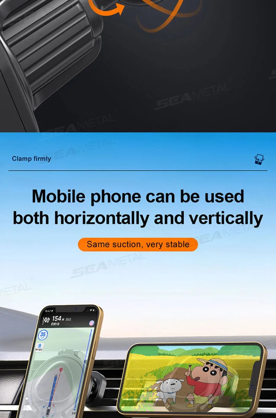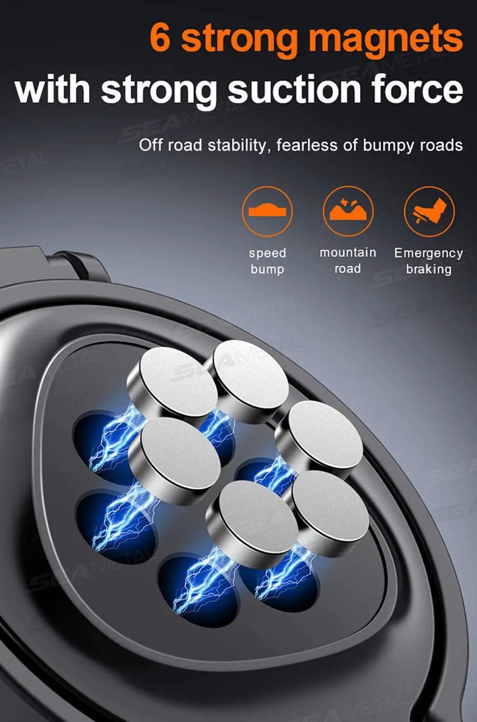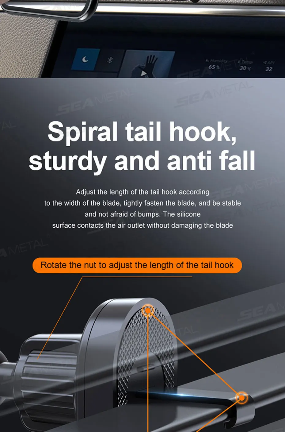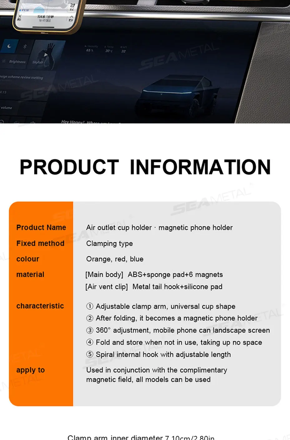 Material: [Cuerpo principal] ABS+almohadilla de esponja+6 imanes [Clip de ventilación] Gancho trasero de metal+almohadilla de silicona