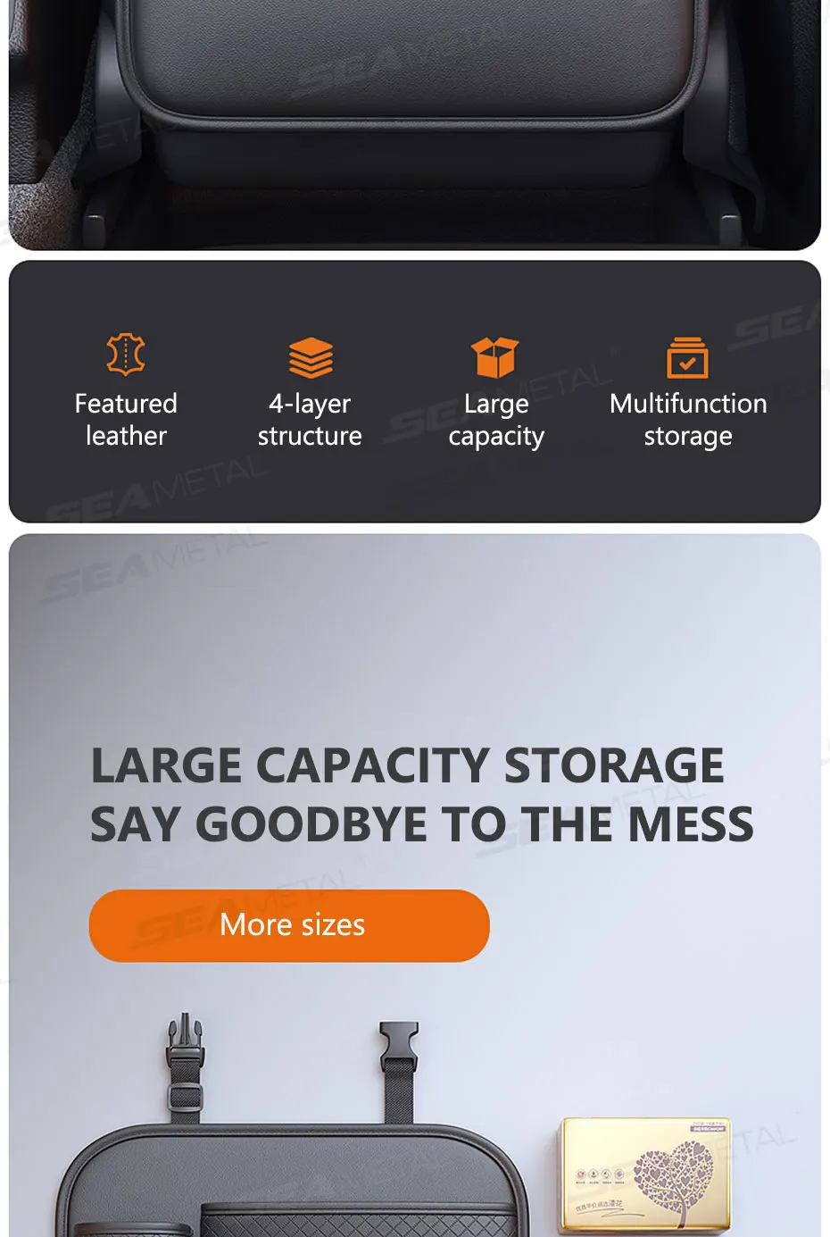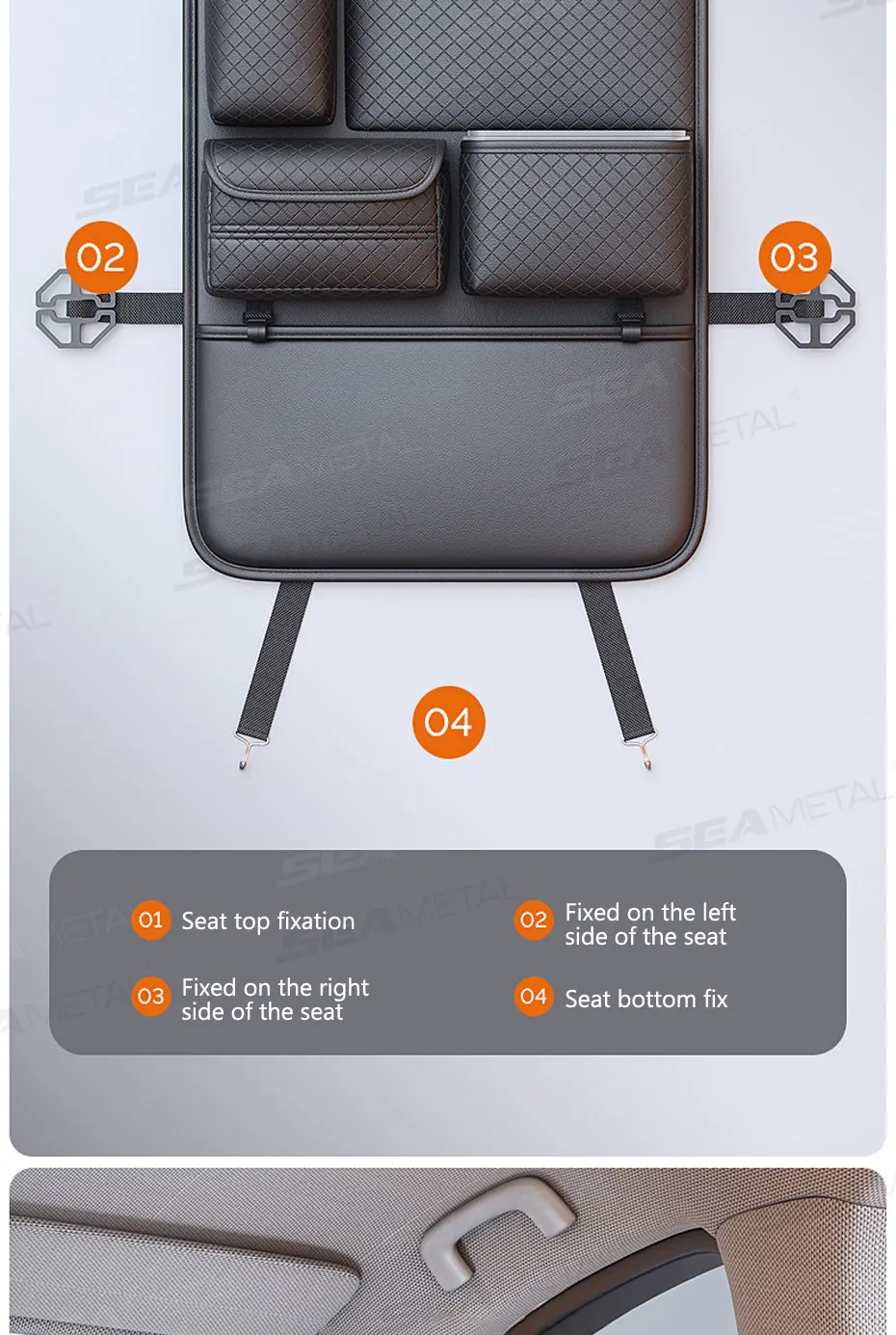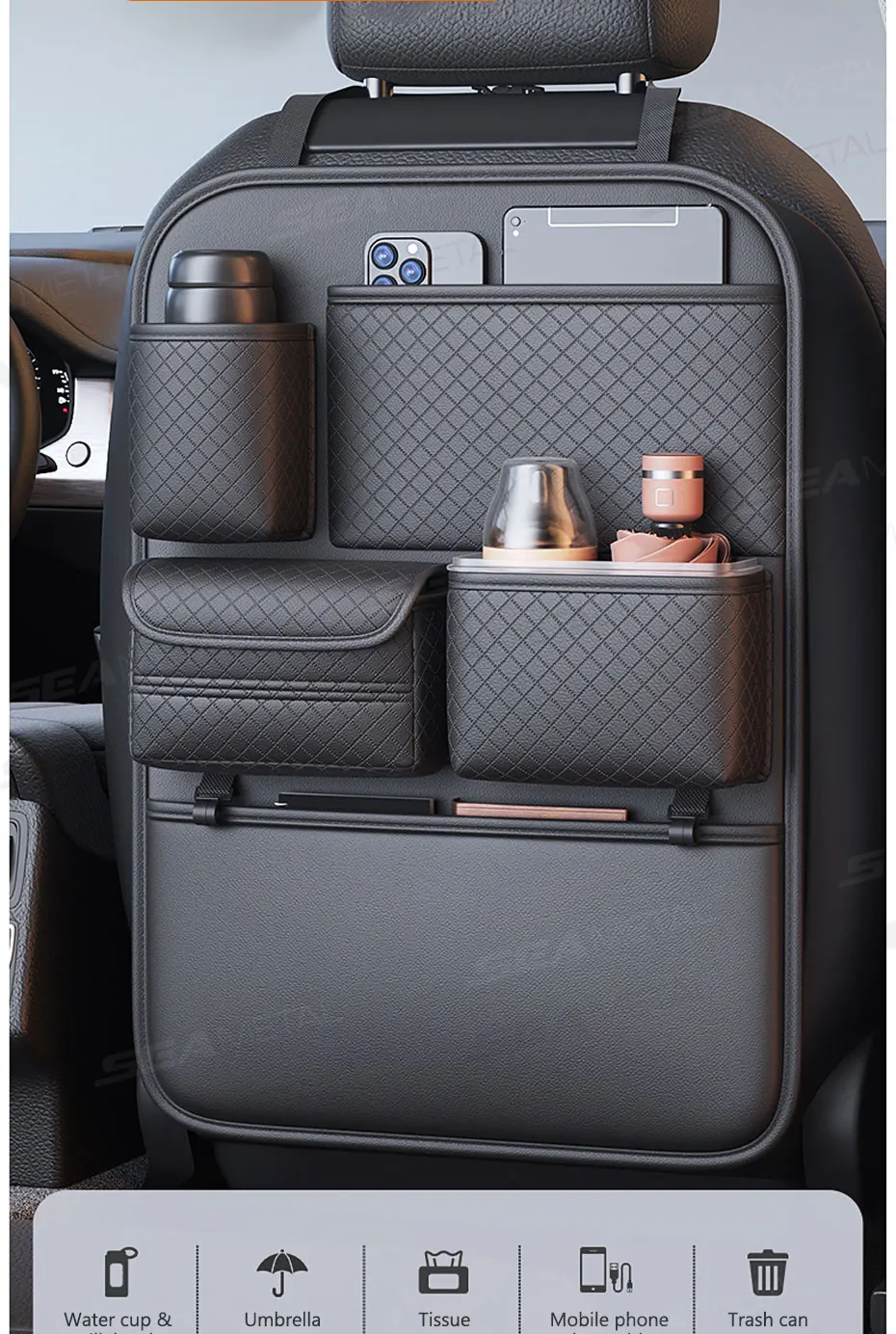 1. Material de cuero PU: Hecho de cuero PU de alta calidad, este organizador para el respaldo del asiento es duradero y fácil de limpiar, lo que garantiza un uso prolongado.